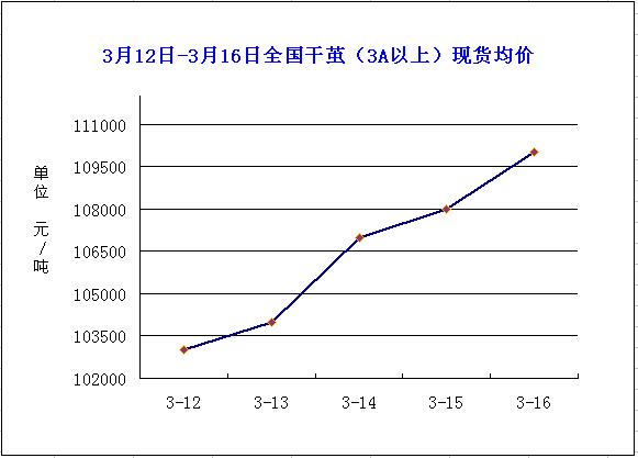 本周干繭是長(zhǎng)款也出現(xiàn)大幅走高,周末現(xiàn)貨均價(jià)達(dá)到11萬(wàn)元/噸。