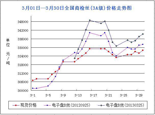 本月繭絲市場出現(xiàn)大漲,可謂也在情理之中。庫存減少以及新繭減少的消息是本月繭絲市場大漲的主要原因。進入3月以來,繭絲市場進入交界期——新繭要等到4月底才上市,而隨著年后生產(chǎn)的逐步進行,干繭以及生絲的庫存量都出現(xiàn)下滑,因此市場走高。另外,坊間一直傳言,受今年多雨與寒冷天氣影響,廣西一帶,江浙一帶,新繭產(chǎn)量將大有減少的肯能,因此,不論是干繭還是生絲都收到此消息影響,而導致干繭以及生絲價格紛紛走高;再有就是3月主力合約的交割,交割前后,大批資金流入現(xiàn)貨以及遠月市場,沖擊了市場行情,現(xiàn)貨以及遠月價格互相影響,價格均出現(xiàn)走高。而月末價格再次出現(xiàn)疲軟,也表明,絲價的空洞漲勢——有價無市——消費跟不上,從而造成絲價并未出現(xiàn)強勢走高,并且延續(xù)時間不長,