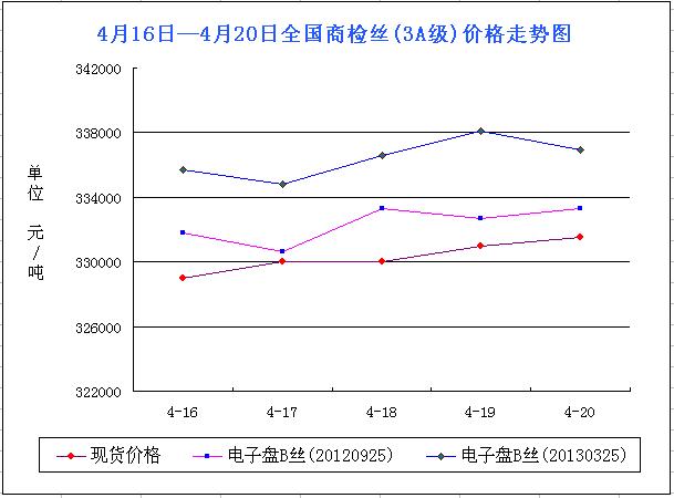 從上圖可以看出,本周繭絲現(xiàn)貨市場行情不弱,隨著5月的到來,新繭正逐步慢慢上市,一批新繭雖然在質(zhì)量和產(chǎn)量上都稱不得上乘,但咎于行業(yè)因素,一批繭子會受到市場和繭站的支持,價格不錯。并且隨著去年繭絲庫存的逐漸減少,新繭市場也較為暢銷,因此對整個繭絲市場而言,無疑是較為利好的。本周價格:國內(nèi)3A級商檢絲現(xiàn)貨均價周初329000元/噸左右,隨后價格出現(xiàn)小幅持穩(wěn),但隨后出現(xiàn)小漲,周末均價在331500元/噸左右,整體漲2500元>噸左右。本周繭絲價格上漲基本延續(xù)上周的勢頭,屬于平穩(wěn)偏輕,但區(qū)間價位較大。據(jù)坊間消息,在一部分地區(qū)少量新繭上市后,大批量新繭還要等到5月上旬左右,廣西四川等地的一批新繭發(fā)種量基本和去年同期持平,但有相關(guān)人士認(rèn)為,受今年天氣影響,一批新繭的上市時間有所推遲,因此可能會造成整個春繭的產(chǎn)量的減少。國際消息,印度上周宣布將該國基準(zhǔn)利率大幅下調(diào)50個基點(diǎn),為三年來首次降息,這對我們的絲綢出口回暖應(yīng)該算是一個利好的消息。另據(jù)消息,美國家居消費(fèi)品開始出現(xiàn)回暖,這表示國內(nèi)絲綢家居品出口量或出現(xiàn)回暖。