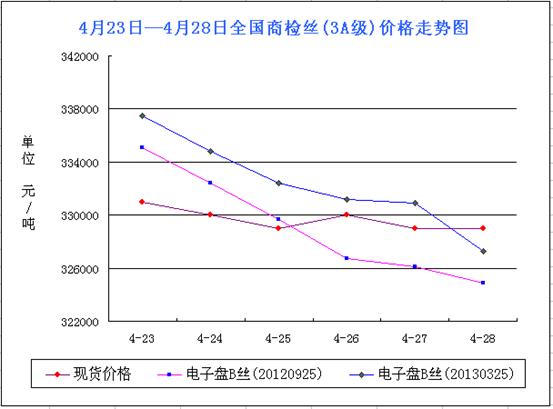 由上圖可知,本周繭絲市場(chǎng)處于區(qū)間弱勢(shì),呈震蕩跌勢(shì),跌幅雖弱,但整體走勢(shì)不妙,盤(pán)面與現(xiàn)貨均出現(xiàn)走低。周末現(xiàn)貨市場(chǎng)均價(jià)基本全線(xiàn)跌入33萬(wàn)/噸大關(guān),繭絲這段時(shí)間以來(lái)高位曾一度躍居33.5萬(wàn)/噸價(jià)位,但自從上周末新繭大批上市后,繭絲價(jià)格也出現(xiàn)走低,進(jìn)入本周以來(lái),開(kāi)始出現(xiàn)短線(xiàn)疲軟走勢(shì),市場(chǎng)再陷膠著。本周價(jià)格:國(guó)內(nèi)3A級(jí)商檢絲現(xiàn)貨均價(jià)周初331000元/噸左右,周初價(jià)格持穩(wěn)狀態(tài),但隨后出現(xiàn)下跌,周末均價(jià)在329000元/>噸左右,整體跌2000元/噸左右。就本周的價(jià)格趨勢(shì)來(lái)看,動(dòng)蕩并不大,區(qū)間盤(pán)整,弱勢(shì)回調(diào),相對(duì)于前期價(jià)格來(lái)講不弱,但對(duì)于繭絲近期高位價(jià)格來(lái)講疲軟不少,且本周的價(jià)格屬于直跌,期間未出現(xiàn)回暖跡象。自新繭上市消息傳出后,零星繭量的交易支撐促使生絲價(jià)格上漲——新繭上市,市場(chǎng)方面做支持,交易價(jià)格好。而隨著4月末的到來(lái),新繭開(kāi)始批量上市,因此原料偏緊的狀況慢慢緩解,生絲支撐不見(jiàn),將再次回到漲價(jià)之前,本周的疲軟態(tài)勢(shì)可見(jiàn)苗頭,據(jù)悉,“五一”前后,廣西地區(qū)的新繭將進(jìn)入規(guī)模上市期,如此以來(lái),絲價(jià)將再受影響,后市或延續(xù)持續(xù)疲軟行情,價(jià)格回落的幅度或?qū)⑴c漲價(jià)相對(duì)。