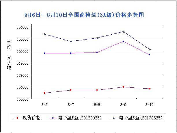 本周,繭絲市場再次上調(diào),延續(xù)上周上漲行情,本周前四日均成走高趨勢,市場價位令人振奮,一直處于強勢盤整中。不過周末價格有所回落,上漲勢頭被遏制。現(xiàn)貨市場本周順利突破33萬/噸,高價一度沖到34萬/噸以上,不過勢頭并不明顯,且又明顯疲態(tài)跡象;盤面9月主力一度逼近35萬/噸,但周五(8月10日)市場回落;明年3月合約本周在35萬/噸左右盤整,周末回調(diào)至34.6萬/噸左右。