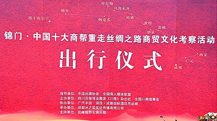 “錦門·中國十大商幫重走絲綢之路”大型商務考察活動是由中國絲綢協(xié)會指導,四川日報報業(yè)集團《川商》雜志、全國川商理事會主辦,四川潤茂房地產(chǎn)開發(fā)有限公司、潤茂·成都國際酒店用品城、廣汽豐田協(xié)辦,駝峰越野車俱樂部特別支持,成都冰之笛文化傳播有限公司承辦,全國商人媒體聯(lián)盟、華西都市報、新浪網(wǎng)等多家主流媒體共同聯(lián)動的大型商貿(mào)交流、文化考察活動。
