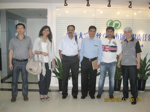 隨著廣西繭絲地位的不斷增強(qiáng),世界眼光開始聚焦八桂大地。2012年9月11日,來自班加羅爾的印度第一大綢廠 Himatsinka Seide 總經(jīng)理助理Venugopal J 先生和Boppna先生、孟買綢廠Prayaga先生、加爾各答絲綢貿(mào)易商Preeti女士一行四人蒞臨廣西大宗繭絲交易市場(chǎng)參觀考察,市場(chǎng)領(lǐng)導(dǎo)予以熱情接待。