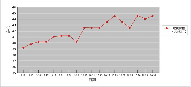 本月廣西第三、第四批秋繭陸續(xù)上市,全國其他蠶區(qū)晚秋蠶也進(jìn)入飼養(yǎng)及收烘階段。由于今年受到干旱、蠶病的影響比較普遍,上半年蠶繭產(chǎn)量、質(zhì)量均不大樂觀。大家把希望寄托在秋繭上,然而雨水不濟(jì),桂南秋蠶飼養(yǎng)早早進(jìn)入尾聲,這更增加了行業(yè)對減產(chǎn)的心理暗示。一邊是繅絲產(chǎn)能的不斷擴(kuò)張,一邊是原料可能性的減產(chǎn)。蠶區(qū)蠶繭收購競爭進(jìn)入白熱化,價格不斷被拉高。以下是廣西宜州德勝蠶區(qū)秋繭收購走勢圖:
